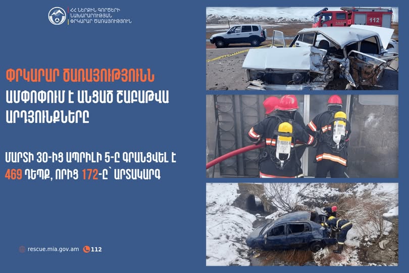 Մարտի 30-ից ապրիլի 5-ը ՆԳՆ 112 օպերատիվ կառավարման կենտրոնում գրանցվել է 469 դեպք, որից 172-ը՝ արտակարգ:
