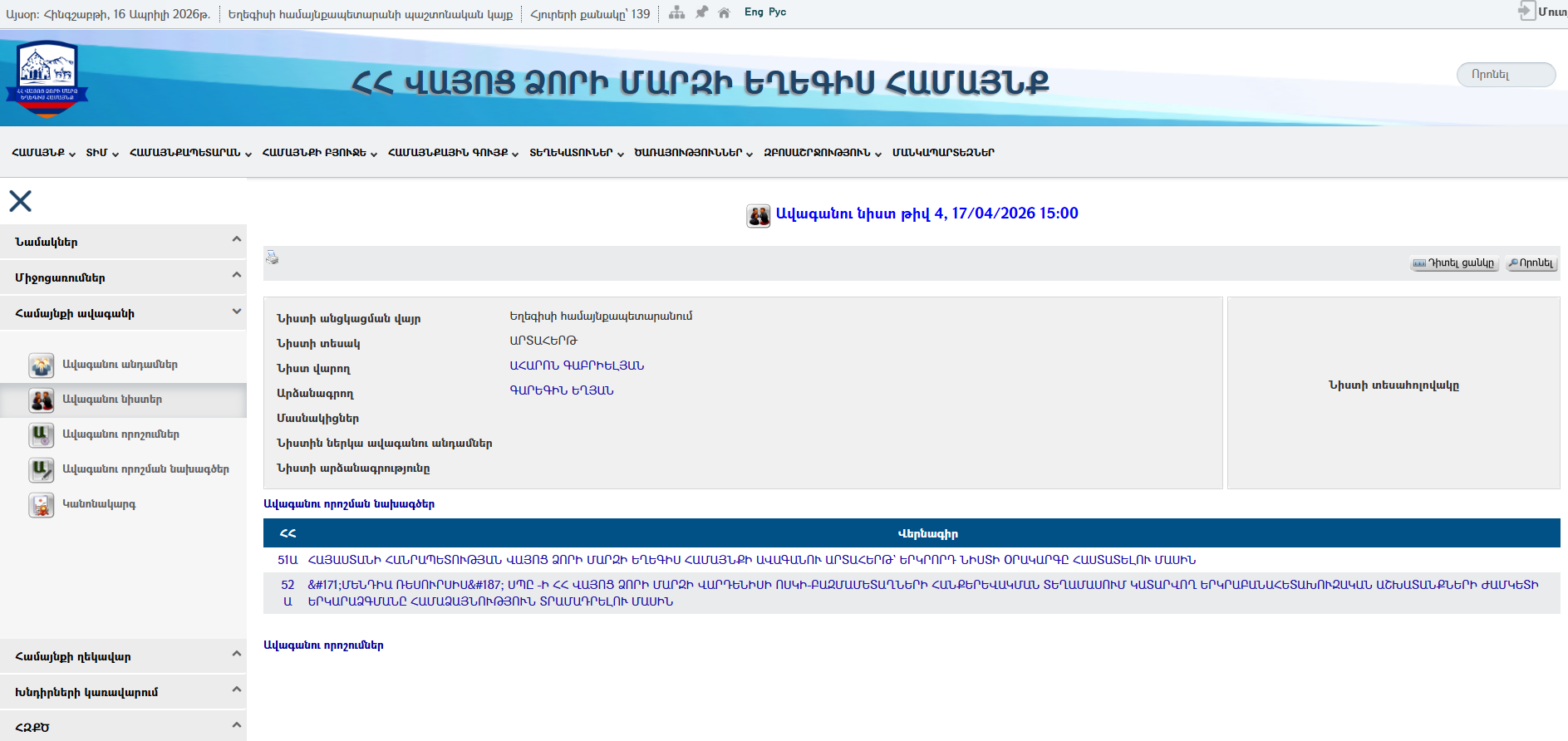2026թ․ ապրիլի 17-ին Եղեգիսի ավագանին այդ նպատակով արտահերթ նիստ է հրավիրել։