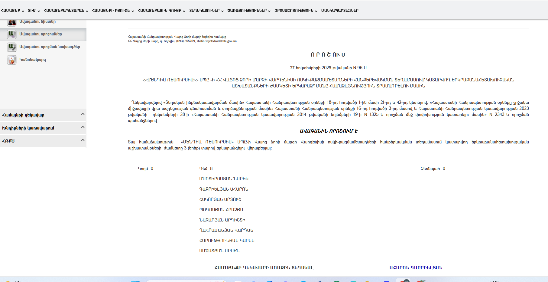 2025թ․ հոկտեմբերի 27-ին կայացած նիստում Եղեգիսի ավագանին անհամաձայնություն էր հայատնել ««ՄԵՆԴԻԱ ՌԵՍՈՒՐՍԻՍ» ՍՊԸ -Ի ՀՀ ՎԱՅՈՑ ՁՈՐԻ ՄԱՐԶԻ ՎԱՐԴԵՆԻՍԻ ՈՍԿԻ-ԲԱԶՄԱՄԵՏԱՂՆԵՐԻ ՀԱՆՔԵՐԵՎԱԿՄԱՆ ՏԵՂԱՄԱՍՈՒՄ ԿԱՏԱՐՎՈՂ ԵՐԿՐԱԲԱՆԱՀԵՏԱԽՈՒԶԱԿԱՆ ԱՇԽԱՏԱՆՔՆԵՐԻ ԺԱՄԿԵՏԻ ԵՐԿԱՐԱՁԳՄԱՆԸ ՀԱՄԱՁԱՅՆՈՒԹՅՈՒՆ ՏՐԱՄԱԴՐԵԼՈՒ ՄԱՍԻՆ որոշման նախագիծն, այդպիսով հայտնելով իր անհամաձայնությունը նախագծին։