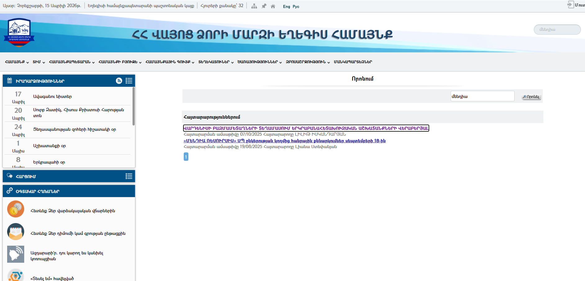 ՀՀ Վայոց ձորի Եղեգիսի համայնքապետարանի պաշտոնական էջում 2026թ․ ««ՄԵՆԴԻԱ ՌԵՍՈՒՐՍԻՍ» ՍՊԸ-ի Վայոց ձորի մարզի Վարդենիսի ոսկի-բազմամետաղների հանքերևակման տեղամասում կատարվող երկրաբանահետախուզական աշխատանքների ժամկետը 3 (երեք) տարով երկարաձգելու վերաբերյալ հանրային լսումների անցկացնելու վերաբերյալ որևէ հայտարարություն չկա։ Ավագանում օրակարգում քննարկվելիք նախագծին կից որևէ փաստաթուղթ ևս կցված չէ։