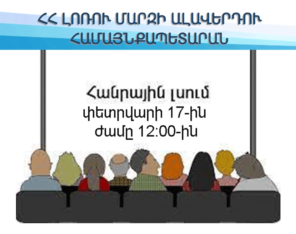 «Շրջակա միջավայրի վրա ազդեցության գնահատման և փորձաքննության մասին» ՀՀ օրենքի (21.06.2014թ. Հ0-110-Ն) և ՀՀ Կառավարության 19.11.2014թ. N 1325-Ն որոշման համաձայն` Ձեռնարկողի կողմից նախատեսվող գործունեության շրջակա միջավայրի վրա ազդեցության փորձաքննության նախնական փուլում՝ նախատեսվող գործունեության վերաբերյալ հանրության ծանուցման շրջանակներում տեղի կունենա Ալավերդու համայնքապետարանի նիստերի դահլիճում՝ Լոռու մարզ, ք. Ալավերդի, Զ. Անդրանիկի 8/1 հասցեում։