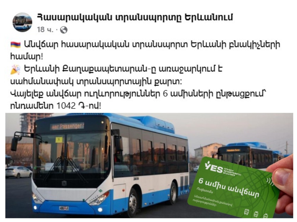 Սոցիալական ցանցերում տրանսպորտից անվճար երթևեկելու խաբկանքի տակ նոր զեղծարարություն է ի հայտ եկել։ «Ֆեյսբուք» սոցիալական ցանցում «Անվճար հասարակական տրանսպորտ Երևանի բնակիչների համար» էջով լուր է տարածվում, որ Երևանի քաղաքապետարանն առաջարկում է սահմանափակ տրանսպորտային քարտ։ Հայտում պահանջվում է անձնական տվյալներ, այդ թվում՝ բանկային։ Էջը կեղծ է։ #Երևանի քաղաքապետարանը տեղյակ չէ»։